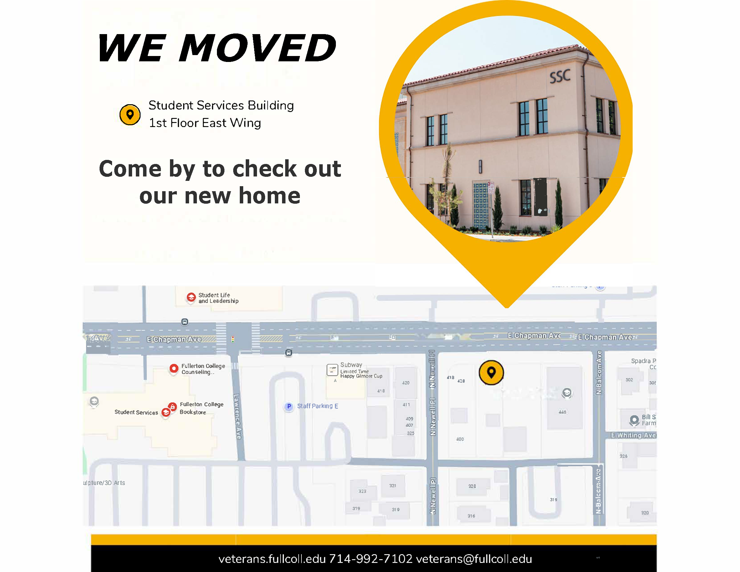 The Fullerton College Veterans Resource Center (VRC) has a new space in the new SSC Building off Chapman Ave and Newell Pl